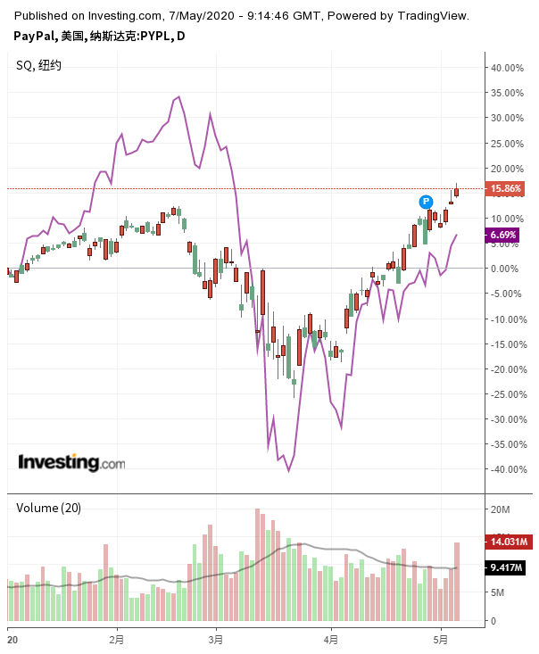 PayPal、Square股价走势对比