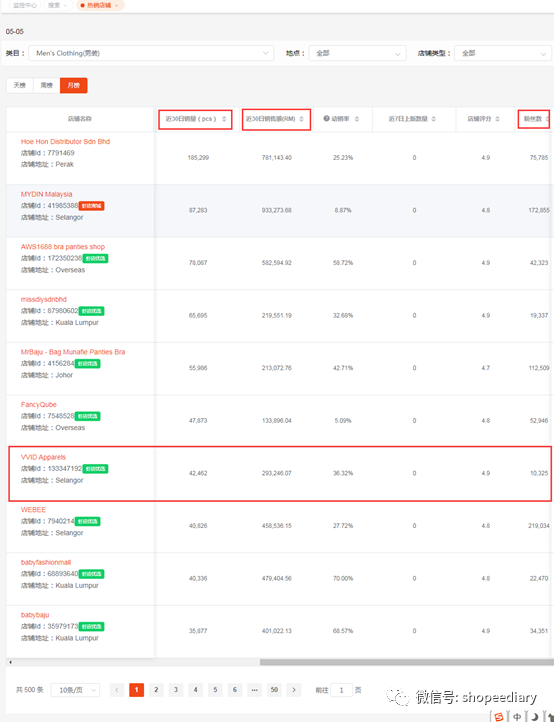 我们从销量、销售额以及粉丝数三个指标判断一个店铺属不属于大卖,利用第三方数据工具,可以快速找到相关类目的热销店铺。 在搜索结果页面,只有一家是做男装垂直类目的-VVID apparels,其他都是杂货铺居多。他家的粉丝量1W+,过去30天销量却有4W+,跟马来的女装beautyone一比,无论从销量还是销售额,都跟beautyone不相上下。beautyone 销量24530,销售额30万马币,开店时间3年vvidapparels 销量42462,销售额29万马币,开店时间1年 “体育与体育户外”也是同样的情况,“热销店铺”第一页根本找不到这个大类目的垂直店铺,都是铺货为主的杂货铺,别人铺货我专业,这个才机会点。 从去年虾皮把代言人从bleakpink换成足球巨星罗纳尔多 ,我们就应该意识到,更换代言人,最终目的是服务于公司的发展策略的,而不是取悦粉丝。取悦粉色只是一个表象,本质是shopee平台自身的发展需要,要把男性用户群体吸引过来,增加平台的受众群体。所以男性类目、与男性市场相关的类目,都是平台的重点类目。