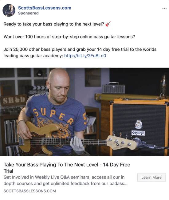 在Facebook广告文案中使用数字是吸引注意力的好方法。当人们看到你的广告时,很大可能是一瞥而过,因此你需要在短时间内取得成功。如果你想要谈论帮助客户获得了什么效果,那就说:“我们帮助增加了27%的利润”,而不是“我们帮助增加了百分之二十七的利润。”数字越具体越好。如果你的公司可以帮助人们在每周的生活用品购物中省钱,那么写“下一次为你省19美元”比“下一次为你节省一些钱”更具吸引力。数字也是显示社交证据和提高信誉的一种好方法。如果你想让人们注册在线课程或会员资格,可以分享现有的会员人数。ScottsBassLessons.com每次都在广告中提到它有25,000个付费会员,来建立可信度。即使你没有用户数,也可以分享你帮助过的人数,例如“其他723位企业家下载了本指南”。尽管这个数字没有用户数更权威,但它确实具有一定的价值。