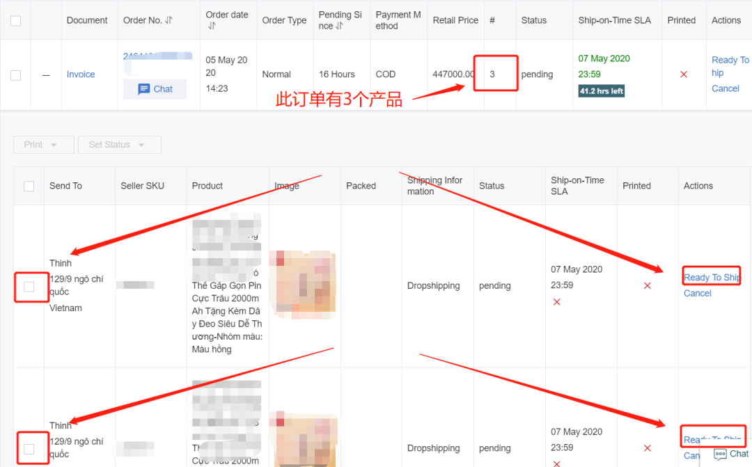 1、什么是拆单 简单来说,就是将客户下单的包含多个Item产品的订单拆分成若干个包裹发货。 如图所示,这个订单包含了3个产品,就可以分别打印面单,分别更改RTS(Ready To Ship)状态进行发货。 2、怎么拆单 如上面所讲,只用将某个订单前面的“+”号点一下,然后对下面的几个订单分别打印面单,分别更改状态,然后打包发货就可以了。 千万不要订单上方的“Set status”,否则就不能拆分了,一定要注意。 3、问答环节 Q:为什么我对单个产品点击Ready to ship,但还是出现了整个订单都标记发货? A:Bunldes产品不允许进行拆单发货(Bunldes为捆绑功能,看你的店铺有没有设置此功能,需要注意) Q:既然可以拆单发货,可以合并订单吗? A:不可以合并订单。