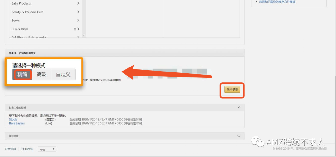 • 产品详细信息:产品详细信息包括产品名称(标题),品牌,描述和图像等属性。这些详细信息都是十分重要的产品信息,对于买家的购买率、产品转化率有着至关重要的作用。• 关键字和搜索词:好的关键字可以使你的产品更容易被买家找到。要了解更多信息,请查看之前文章”如何确定亚马逊产品关键词?“。• 类别确认:要确认自己商品的类别,并了解是否”需要申请“或者是“禁售”。批量上传和手动上传需要的信息和准备基本一致,准备事项可参考手动上传的前期准备。路径:从“管理库存”下拉列表中选择“批量上传商品 ”。准确选择浏览或搜索与你要销售的产品匹配的类别。找到合适的类别,点击“选择”。再选择你上传模板类型。(推荐精简模型,方便填写内容最少)选定好模式,之后点击“生成模板”,就可以下载批量上传库存文件。
