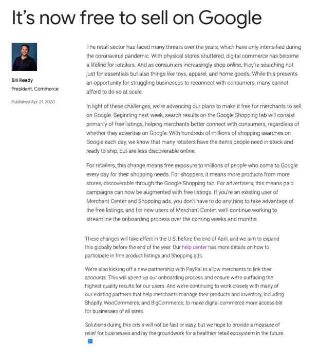 为了帮助广大跨境卖家与潜在消费者建立更好的联系,缓解零售和小企业生态系统因为新冠疫情带来的伤害,4月21日,谷歌官方宣布,美国地区Google Shopping将开放免费商品广告区域,并计划今年年底之前将其扩展到全球。