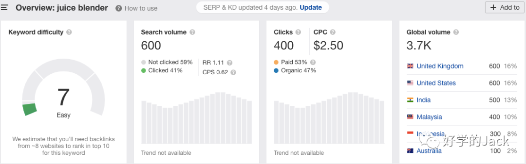 比如说下面的这个juice Blender 榨汁机,这个词全球搜索量一个月也才3.7k, 在美国一个月也才600,排名做上去流量也不大。
