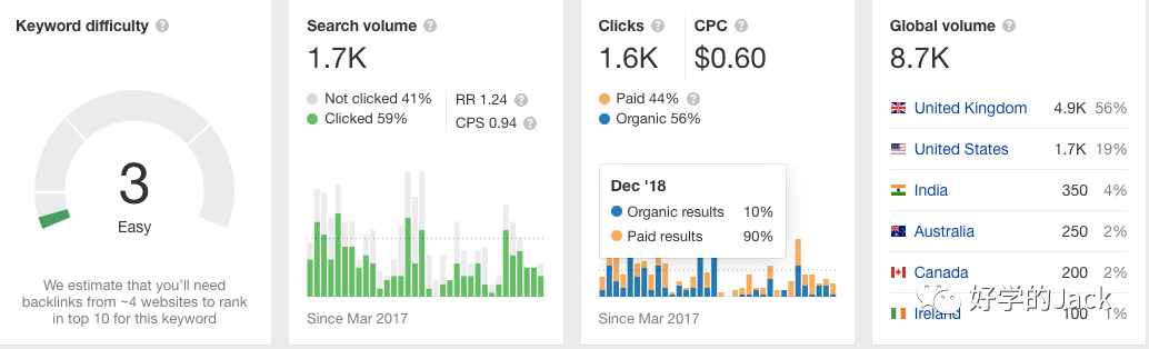 下图的这个关键词竞争难度,keyword difficulty为3,排上谷歌首页难度比较低,而且排上去流量也还不错。