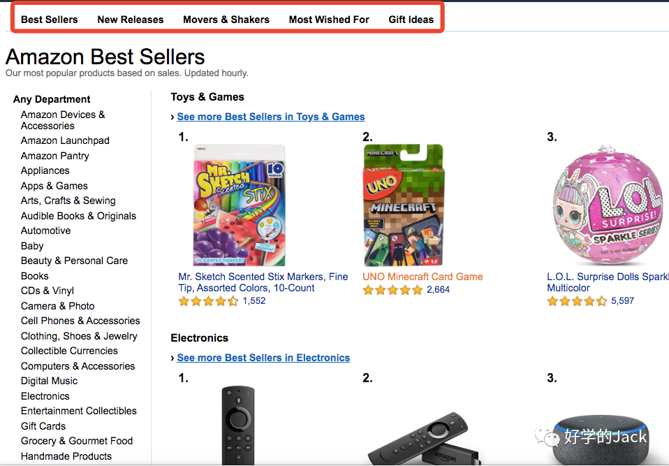 Amazon可能是使用最广泛的工具了,Amazon下面还有几个细分的类目,比如说Amazon bestseller, Amazon most wished for, Amazon gift ideas, Amazon movers and shakers, Amazon new releases. 接下来说下这几个细分类目的各自侧重点。