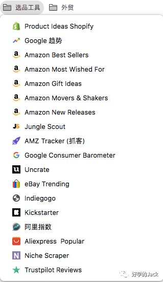 再说下选品用了哪些平台,选品用了蛮多平台和工具的,这些工具我专门建立了一个浏览器书签,每天上班就打开电脑,一个个进去看。