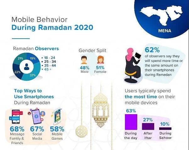 斋月期间,中东和北非地区消费者的智能手机使用量一直呈增长趋势,该地区的网络在线时间和消费者支出均高于一年中的任何其他时期。