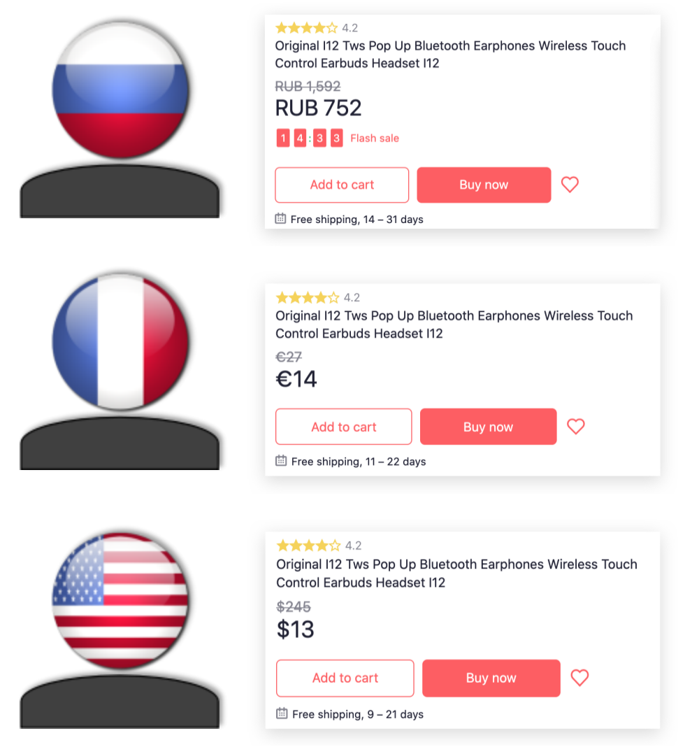 正如客服在上面回答所说的,Joom物流是一种平台自动根据产品属性计算各国运费的模式,平时不同国家的消费者在平台上看到的价格都是卖家设置的产品售价+系统计算运费。如下图,科学上网后可以看到不同国家显示的运费和价格,此外,由于运送渠道的时效不同,平台提示的送达时间也会有不同。