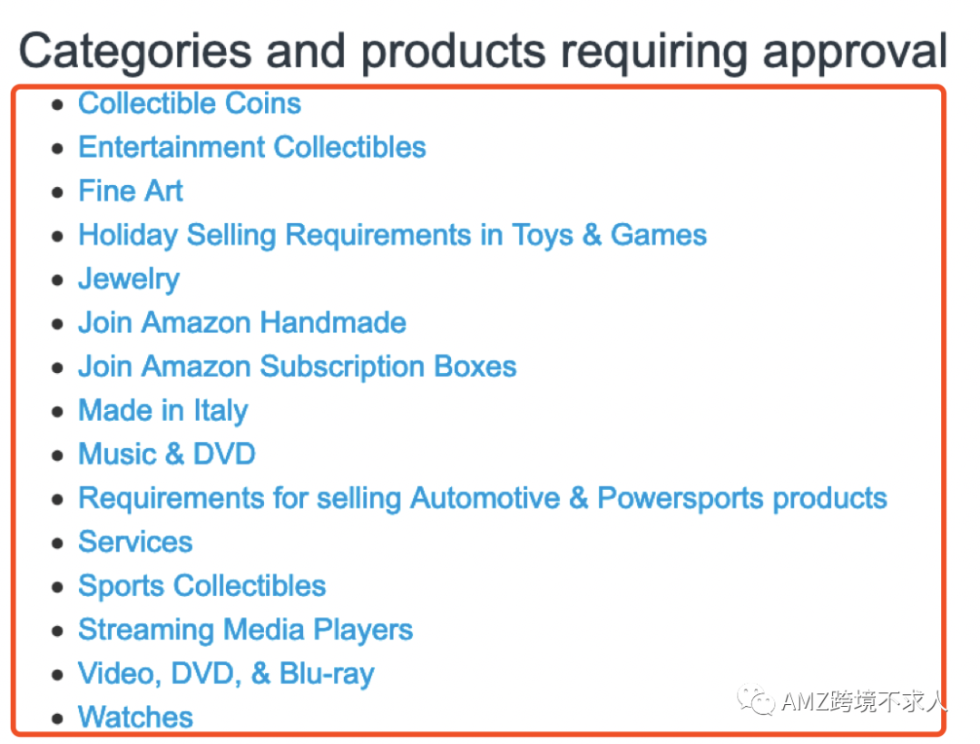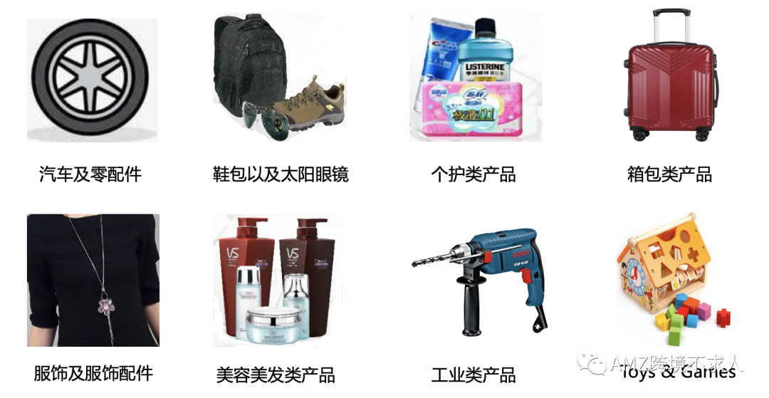 1. Automotive Parts (汽车零部件);2. Clothing, Accessories & Luggage (服饰、箱包周边产品);3. Collectible Books (收藏书籍);4. Industrial & Scientific (工业和科技制品);6. Motorcycle & ATV (摩托车);7. Sexual Wellness (成人用品);8. Shoes, Handbags & Sunglasses (鞋类、手提包、太阳镜);9. Sports Collectibles (体育用品);10. Toys & Games (Holiday season only) (节假日时期需要申请);(仅供参考,具体详情以卖家后台为准)