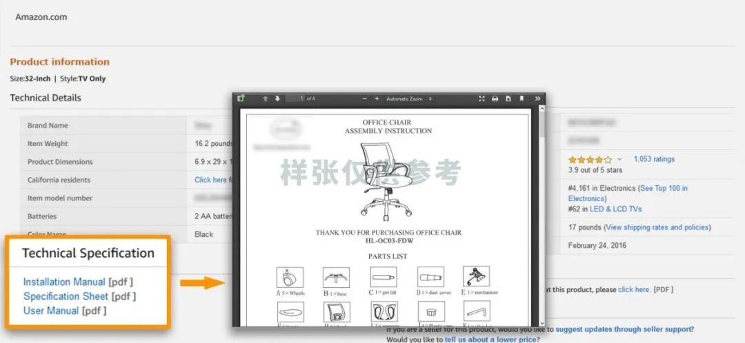 在看完卖家相关信息后,吉姆开始浏览商品的相关参数及使用说明,以确保这款办公椅的材质合适,方便升降,能和员工各自的办公桌配套使用。另外,看了详细的安装指南和使用者说明后,吉姆发现这款办公椅很容易组装,员工参照说明自己就能操作。