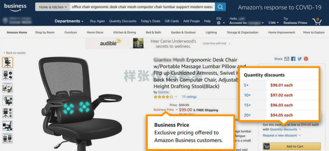 吉姆欣喜地从价格描述中了解到自己可以享受企业价格及批量折扣价格——这款办公椅满20件即可打95折!