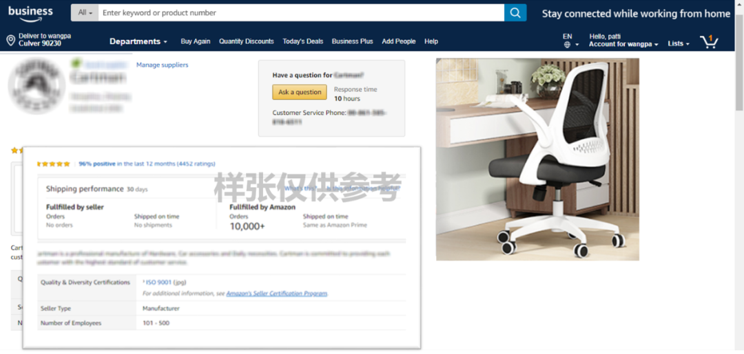 考虑到批量采购有一定的风险,吉姆决定看看卖家的店铺详情,了解其资质——这个店铺专卖办公桌椅,持有质量证书,店铺评分5颗星,由亚马逊物流配送,过去半年好评100%。