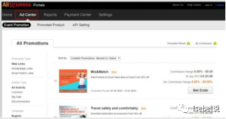 登录链接 http://portals.aliexpress.com,并转到”广告中心”,可以获得各种促销的材料。比如活动促销和相应的促销产品API。
