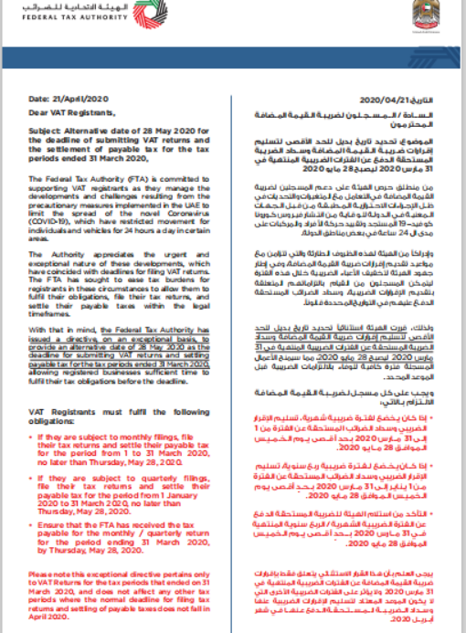 针对VAT增值税申报,4月21日,阿联酋税局也颁布了新的政策,Q1季度的申报以及税金缴纳,将延长一个月,截止日调整为5月28日。