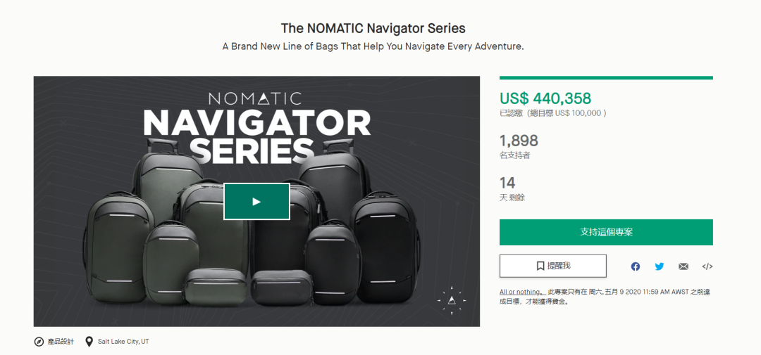 NOMATIC Navigator系列,全新的旅行冒险箱包系列,上线至今筹款金额已经达到了$440,358。