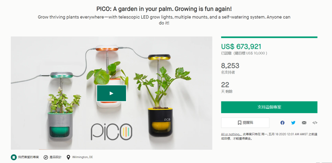 PICO,借助伸缩式LED植物生长灯和自动浇水系统的智能掌中盆栽,上线至今筹款金额已经达到了$673,921。