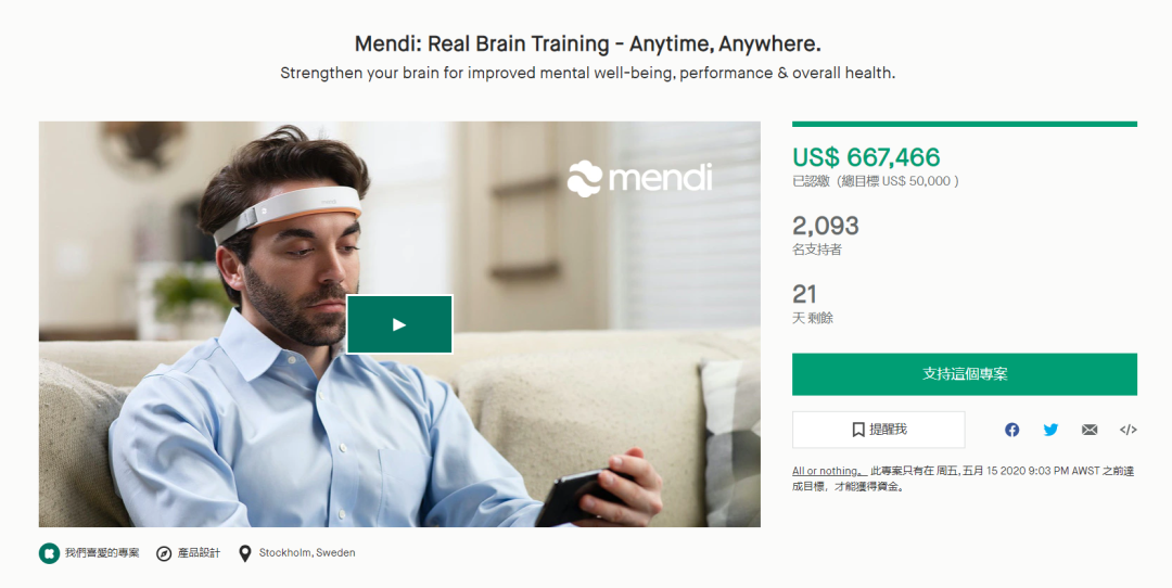 Mendi,首款专为家庭使用而设计的临床级神经反馈大脑训练产品,在上线不到48小时内,筹款金额已经达到了接近$300,000。