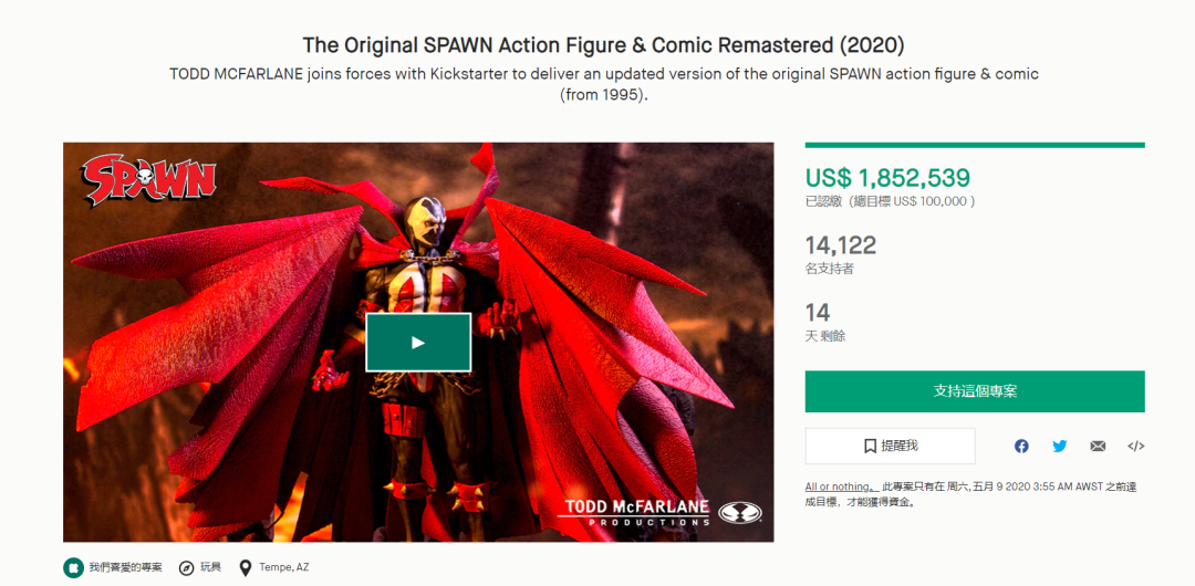 原始SPAWN动作人偶,在上线不到24小时内,筹款金额已经达到了$880,381。