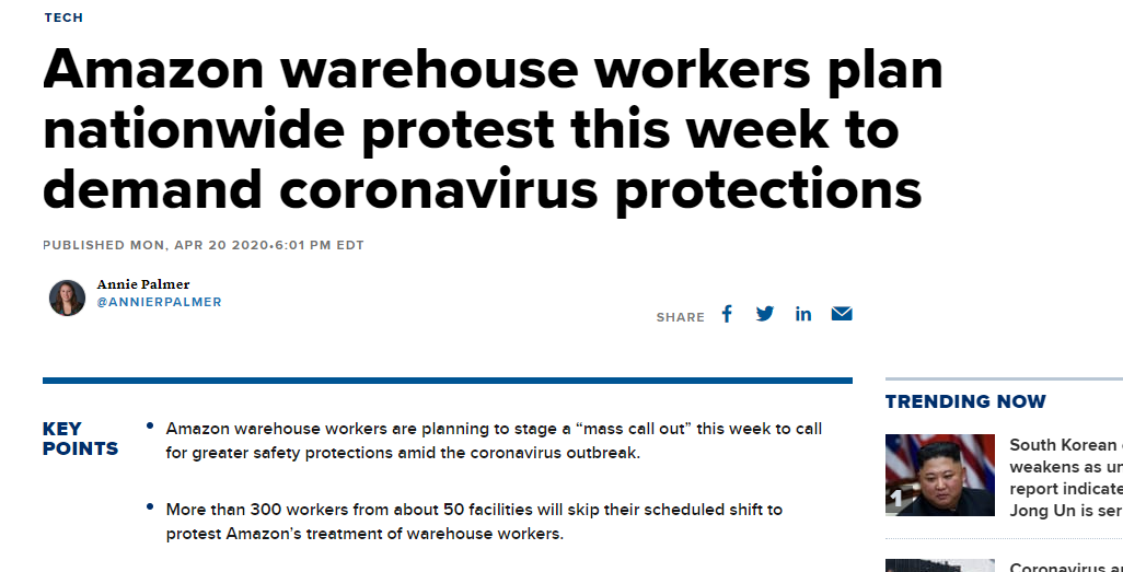 自从疫情加剧,全美各州都宣布进入紧急状态并暂停所有非必要产业之后,亚马逊工人的抗议就没有停过。