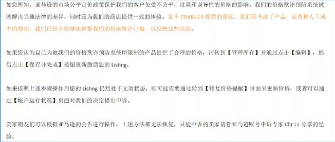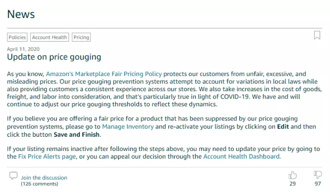 幸运的是,4月11日,亚马逊发布了关于“价格欺诈的更新”,具体内容如下: