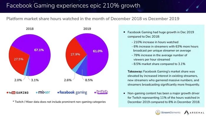 这些努力确实收到了成效 — 根据streamelement的数据,2019年12月,Facebook的游戏观看时长同比增长了210%,在整个游戏观看时长中占据了8.5%的市场份额。