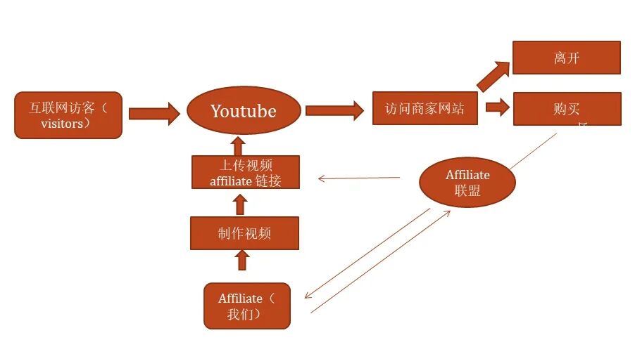 国内的知名的视频网站优酷,国内名气很大,但放到油管面前没法比(全球份额45% vs 3%)。巨大的流量,巨大的用户,必然是巨大的赚钱机会!!!而且Youtube可以在视频的描述和内容里面加入推广信息(视频描述区直接上链接),而我们只需要利用这个机会,推广别人的产品,无论是实体产品还是虚拟服务,都能够获得不菲的佣金。这种赚钱方式在国外叫做Affiliate Marketing,是一种非常成熟和靠谱的网络赚钱的方法。很多人包括我就是以此为职业,完全可以作为正规长久的谋生手段。这个行业有亚马逊、谷歌这样顶尖的参与者,也有不计其数的affiliate network(联署营销联盟)和affiliate。Youtube + Affiliate marketing 运作模式如下: