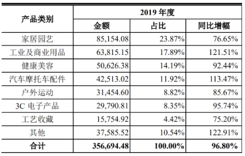 众所周知,公司主要产品类型包含汽车摩托车配件、工业及商业用品、家居园艺、健康美容、户外运动、3C 电子产品等,其各品类的主营业务收入情况如下: