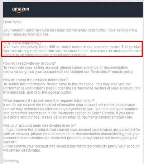 您的亚马逊卖家帐户已被永久停用。您的listing已从我们的网站中删除。 为什么会这样? 原因是:您在我们的消费者商店中欺骗性地列出了N95或类似口罩。目前,该产品类型在Amazon上禁止销售。在Amazon.com上出售的商品必须遵守所有适用的法律和亚马逊的政策。 亚马逊表示,要想重新激活销售帐户,需提交证明帐户未违反平台受限产品政策的证据或文件。如果亚马逊没有收到所需要的信息,卖家的帐户将保持停用状态,并且平台可能会永久扣留卖家的款项。