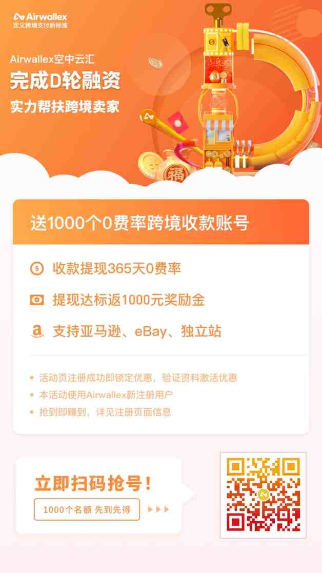 刚刚完成D轮融资的Airwallex(空中云汇),开放1000个首年365天收款提现0费率账号,帮助在亚马逊、eBay、独立站开店的中小卖家缓解资金压力。