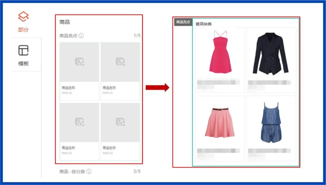 部分选项:查看装饰组件,并将新组件添加到画布中 画布:查看装饰组件在商店中的显示方式 组件属性栏:输入组件的图片、产品或类别