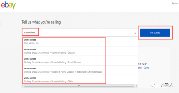 首先要选择分类。以eBay.com为例,您可以直接在输入框‘Tell us what you're selling’中输入您想售卖产品的关键词,eBay会给你推荐一些分类,通常第1个分类是最接近的。
