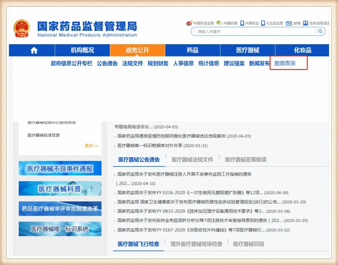 医用口罩在中国属于二类医疗器械,是由省一级药品监管部门实施注册管理,可以通过医疗器械查询医疗器械准入号进行查询。 首先打开官网 http://www.nmpa.gov.cn/ 在“政务公开”栏目下面选择数据查询 http://www.nmpa.gov.cn/ 进入后在医疗器械一栏按需选择 http://www.nmpa.gov.cn/