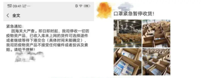 根据某货代发出的公告:受海关对防疫物资产品升级严查影响,即刻起所有渠道暂停一切医用防疫物资产品,符合要求的民用物资可以安排,但时效同样会受到影响。已交进的防疫物资产品转运时效将会有延误。