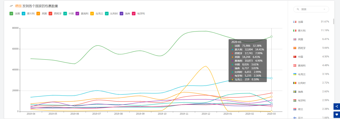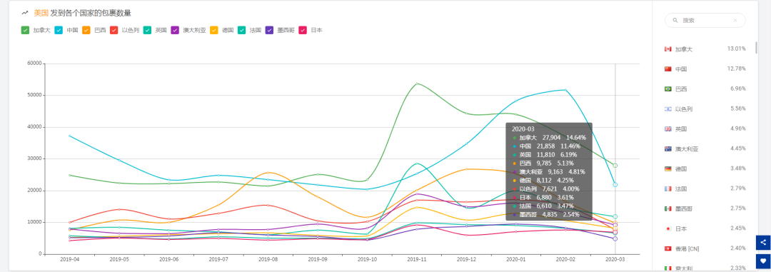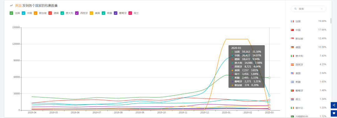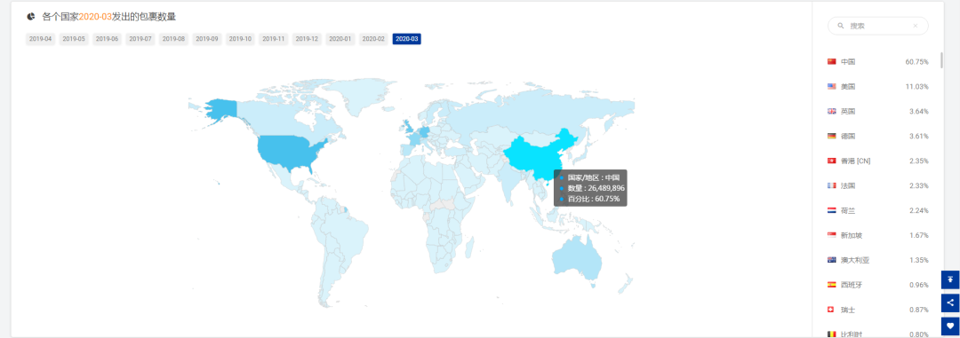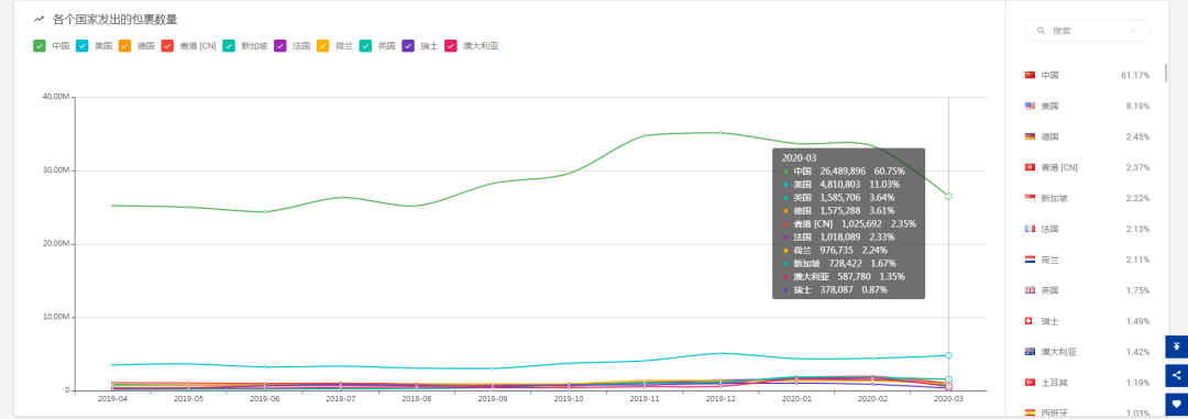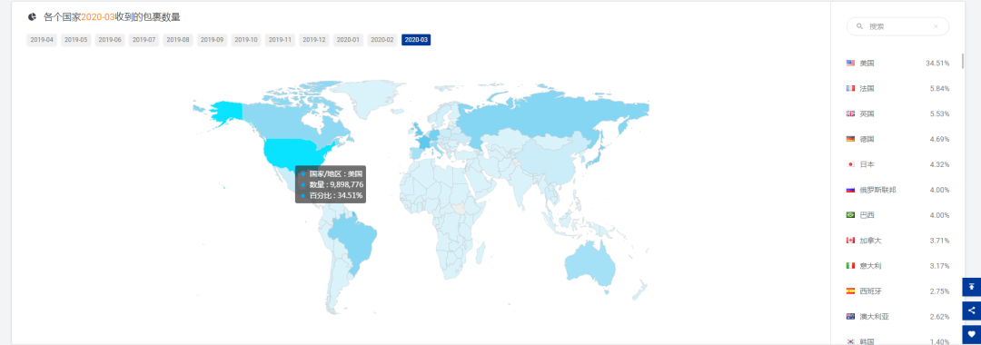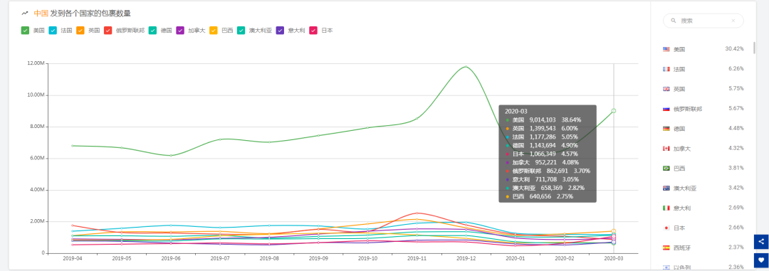 注:中国邮路发出的包裹,较2月份有非常明显的上升,其中收件排列前三的国家分别是美国占38.64%、英国占6.00%、法国占5.05%