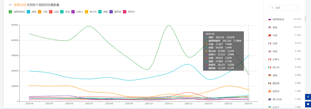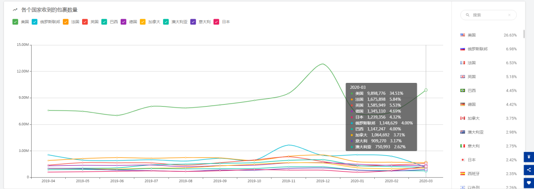 注:美国的收件量较过去12个月平均上升7.88%(升幅明显)、俄罗斯下降2.98%(降幅明显)、法国下降0.69%