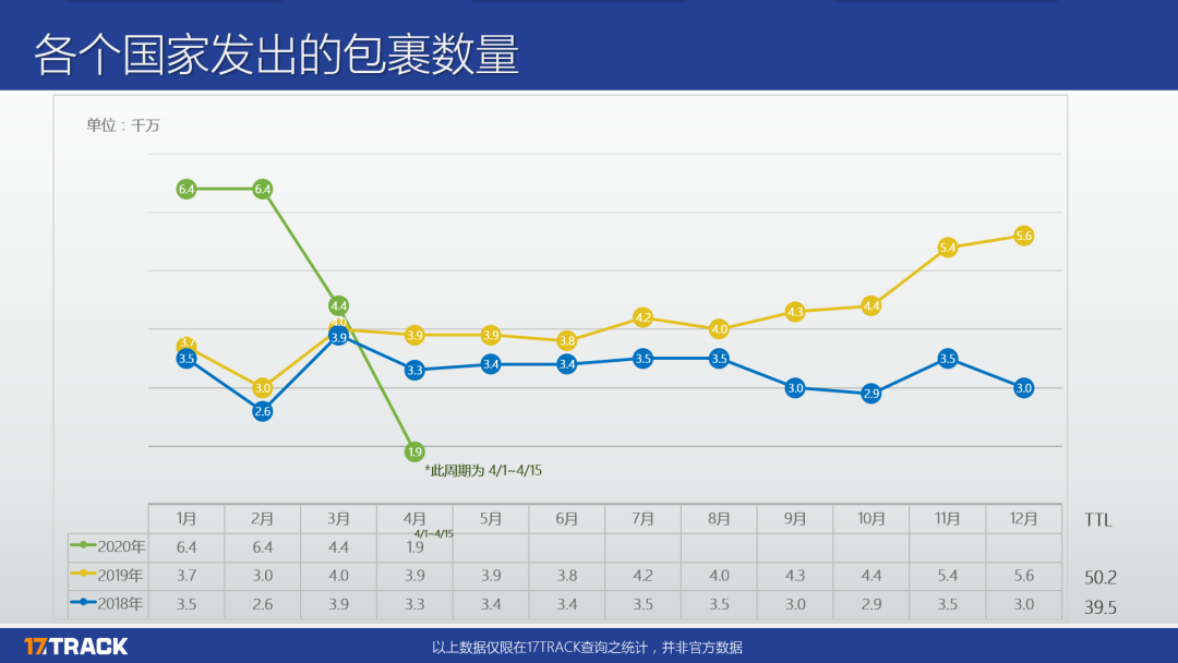 从下图可以看到,2020年3月份的包裹量,仍然是高于过去两年的历史数据,而且幅度也会高一些;4月1日~4月15日,收录到的包裹发出量为1,900万,预计也会高于去年同期。