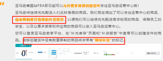 据了解,亚马逊现在仍然是继续优先配送需求较高的商品,所以目前能够创建货件但有些有数量限制,这些商品将会带有“限量补货”的标记。