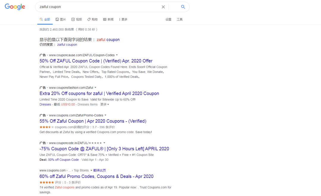 那么可能有人会问我佣金设置多少合适?我给的建议是没有固定标准。可能给太高,你会亏钱,给太低你会没有流量。而且大件的产品不适合推广。我们在做联盟营销的同时是可以提升Google的SEO权重的。如果你投了联盟营销的广告,他会自动帮你去谷歌投放广告,如图所示,zaiful这个品牌做了联盟营销coupon,网站会自动帮他推广,这也是给网站带来自然流量的方式。大家要注意的是,shareasale必须独立站卖家才可以注册,如果你没有独立站,你可以找一些国内免费的建站工具,建一个网站,之后上传产品就可以注册了。