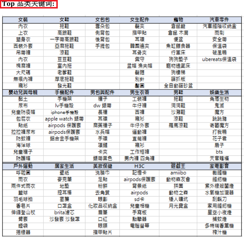 这类词包含产品词、品牌词、属性词、长尾词等。比如,如果我们要卖外套,那外套就分女外套,男外套等。其中,女外套又会被分成薄外套,厚外套,纯棉外套,羽绒外套,棒球服,戴帽外套,西装外套等等。