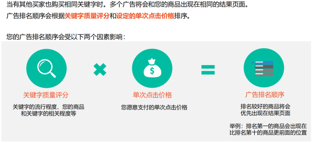 既然说到这,那就顺便讲一下,shopee广告的排名是怎么一个逻辑。关键字广告的排名由两点决定:一个是竞价,一个关键字质量分。