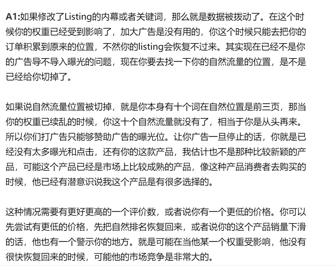 A3:前面有回答,因为你的自然流量受到了影响,所以你怎么样打广告,消费者都有定向的判断选择的问题。你广告烧完了,他就没有转化,然后你又依靠自然流量,所以你会感觉你广告怎么打都没有用,因为平时可能自然流量对你的影响比较大,他已经占据了一定排名,然后你的这款产品(我猜测应该不是很新颖,消费者转化率就是觉得很新奇,然后未购买转化率,平时可能不是那么高的产品),所以你这种产品更需要是靠自然流量的。