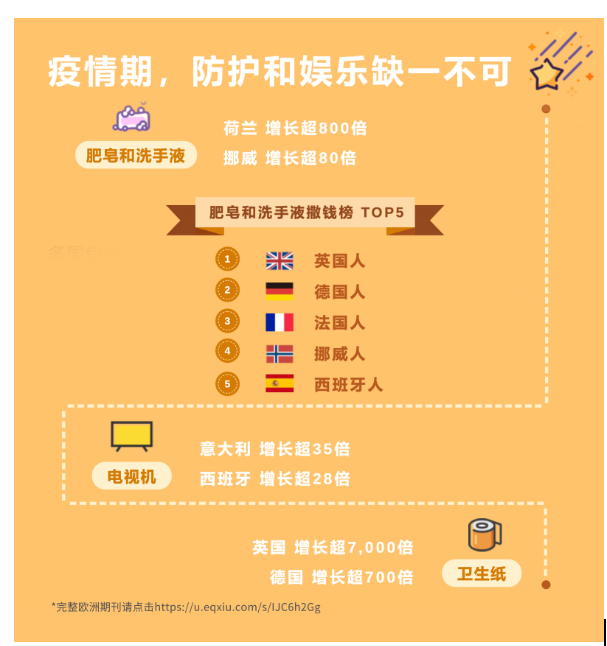 其中,回顾今年 2、3 月份部分欧洲国家的数据显示,很多居家场景下使用的商品销售明显高于去年。跨境电商“宅经济”迎来巨大爆发。