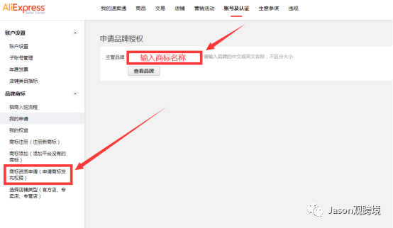 速卖通品牌授权提交会到以下这个环节,提供我们给到您的商标名称输入→主营品牌→点击查看品牌→自动勾选相同类目;提供我们给你的商标授权书和身份证正反复印件上传速卖通后台进行审核,一般审核时间1-3天;