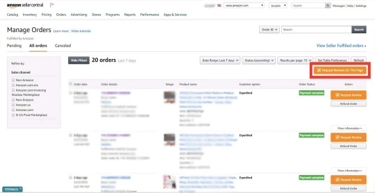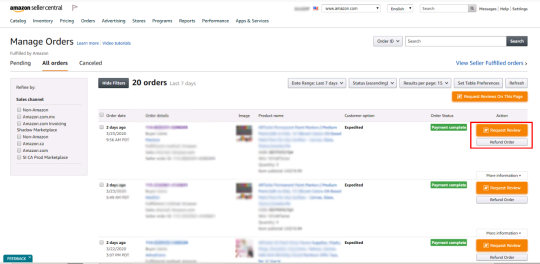 通过嵌入「SellerMotor智能浏览器插件」,卖家只需进入亚马逊订单管理界面,点击右上角的「Request Review on this page」按钮,就能向页面上的所有订单发送索评邮件,当然,一键批量索评需要卖家对自身的商品非常有信心。
