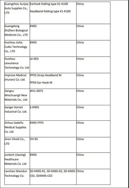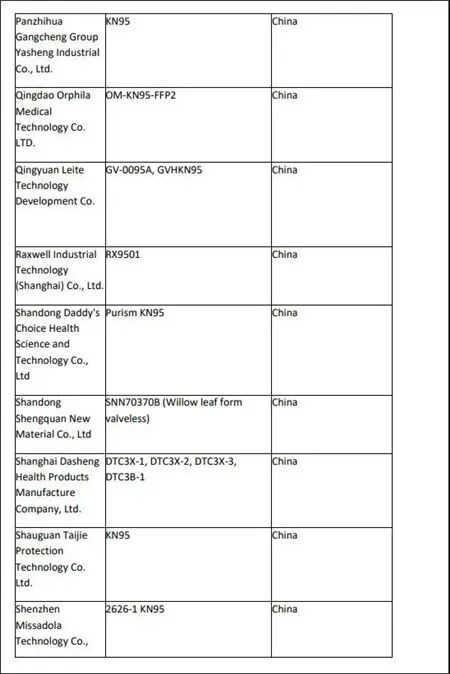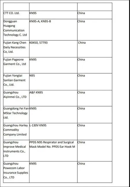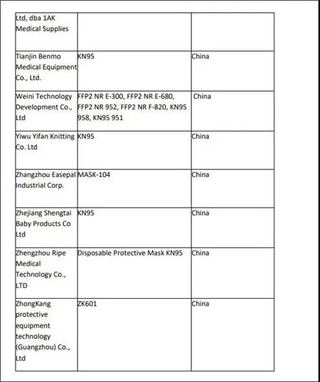 名单中包含巴西、韩国、日本、澳大利亚、欧洲、墨西哥和中国(含国内的四个口罩型号:KN100、KP100、KN95、KP95),共七个国家和地区。