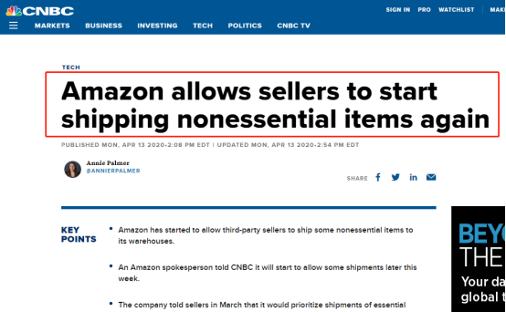 除了销售卫生纸、消毒湿巾等必需品以外的卖家表示,他们被迫休假或解雇员工,而且还削减了广告支出。虽然第三方商家仍然可以在亚马逊上销售非必需品,但他们无法使用亚马逊配送服务(FBA)。有亚马逊卖家表示,注意到一些被归类为非必需品的产品已被“解封”了,一位卖家称,亚马逊告知他们现在销售非必需品的可以开始补货了。
