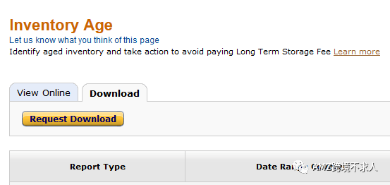 3、点击“Request Download”下载库存时间报告查看仓库中商品的存放时间。