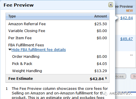 3、在弹出页面内点击Show FBA fulfillment fee details查看具体的FBA费用明细。