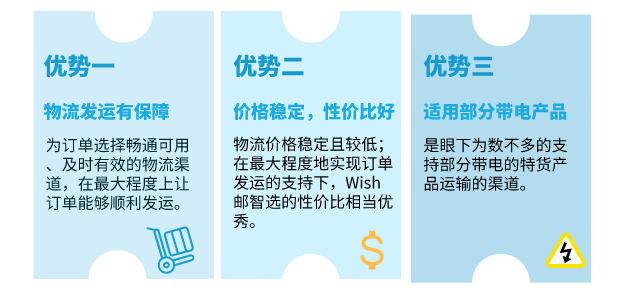 除了物流渠道优势、性价比优势外,“WishPost智选”项目也是眼下为数不多的支持特货产品运输的渠道。“WishPost智选”项目的“Wish邮智选 - 特货”物流渠道支持部分带电产品的运输*,为商户多样的产品运营提供有力支持!