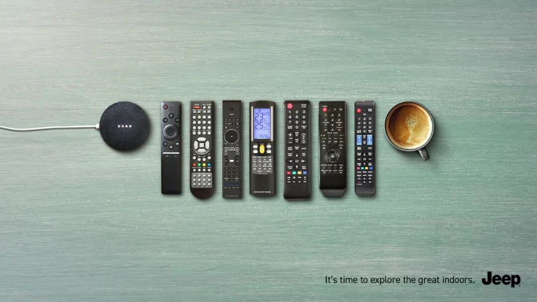 Jeep最近在澳大利亚发布了一组主题为「The Great Indoors」的创意平面,因为疫情原因人们无法开车出门,宅在家里也可以探索出另一番风景,比如机顶盒咖啡和遥控器套装,沙发一躺一整天: